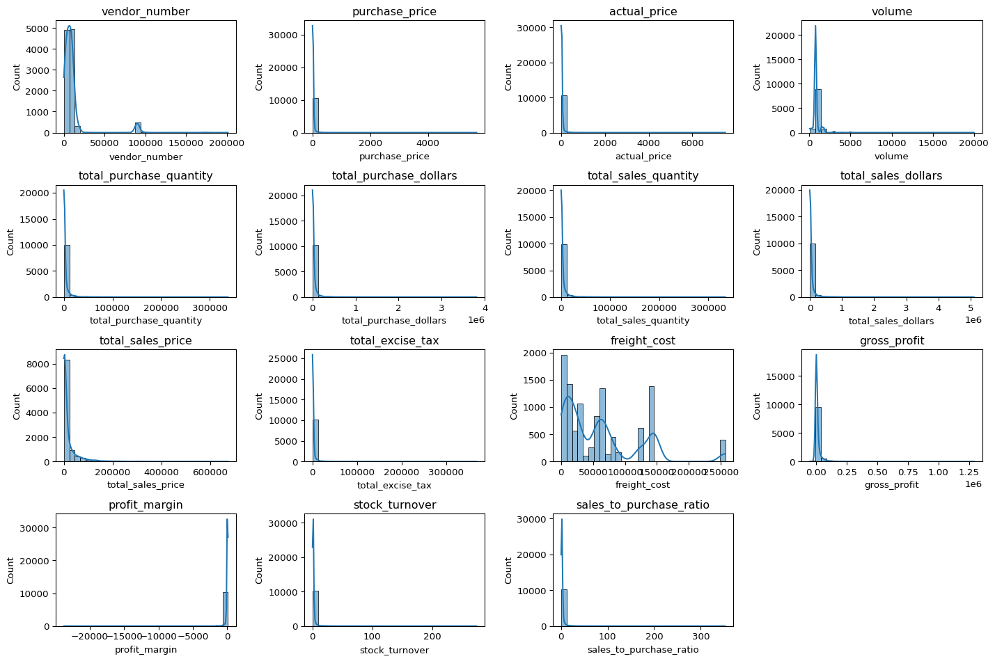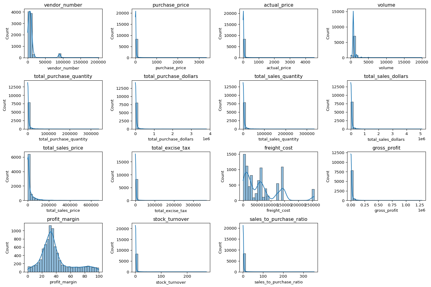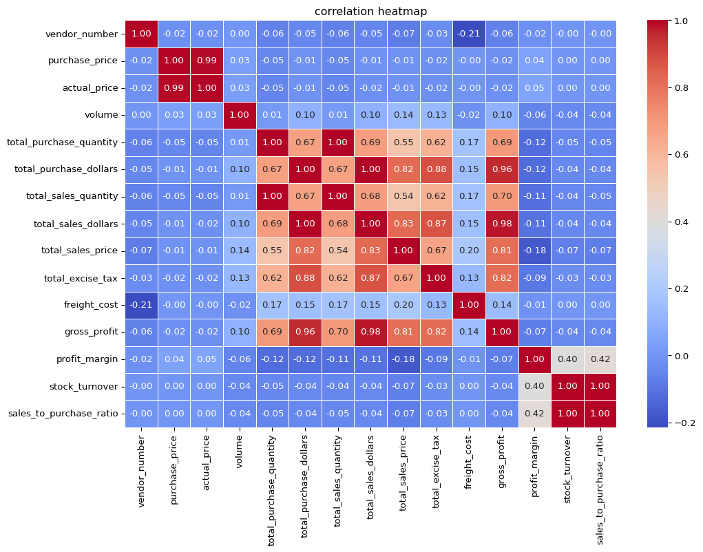 Previously, we examined multiple tables in the database to determine which key variables should be included in our final dataset. In this phase, we analyze the resultant table โ mart.vendor_sales_summary