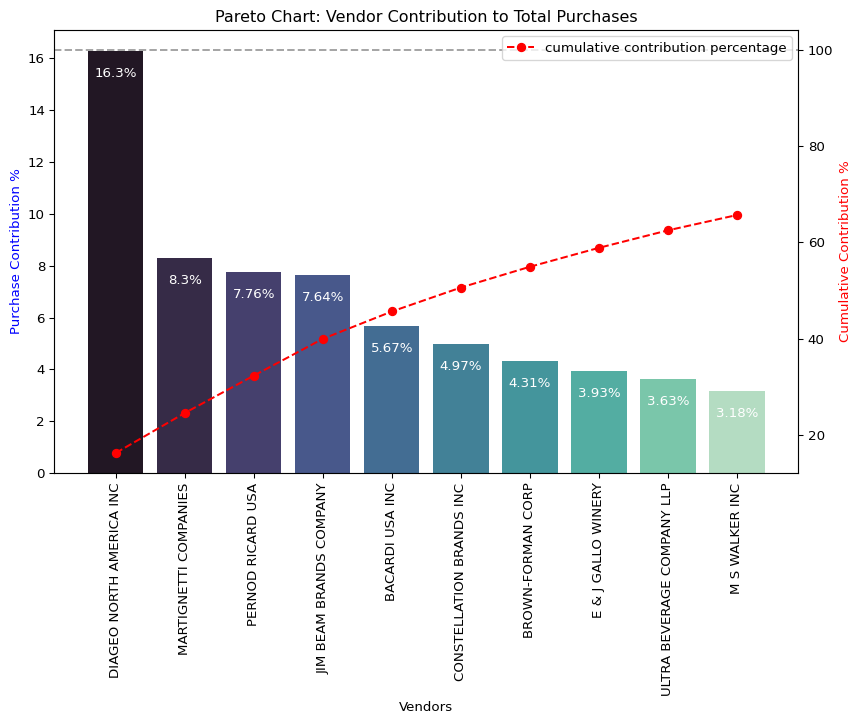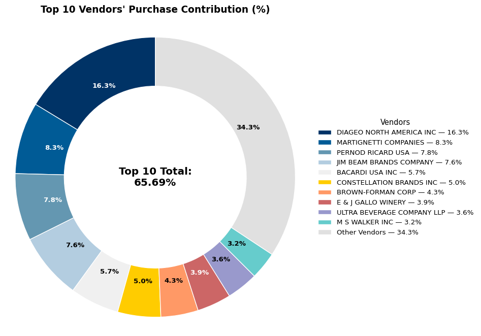 Vendor Concentration: The top 10 vendors contribute ~66% of total purchases, indicating high procurement dependency on a few large suppliers.